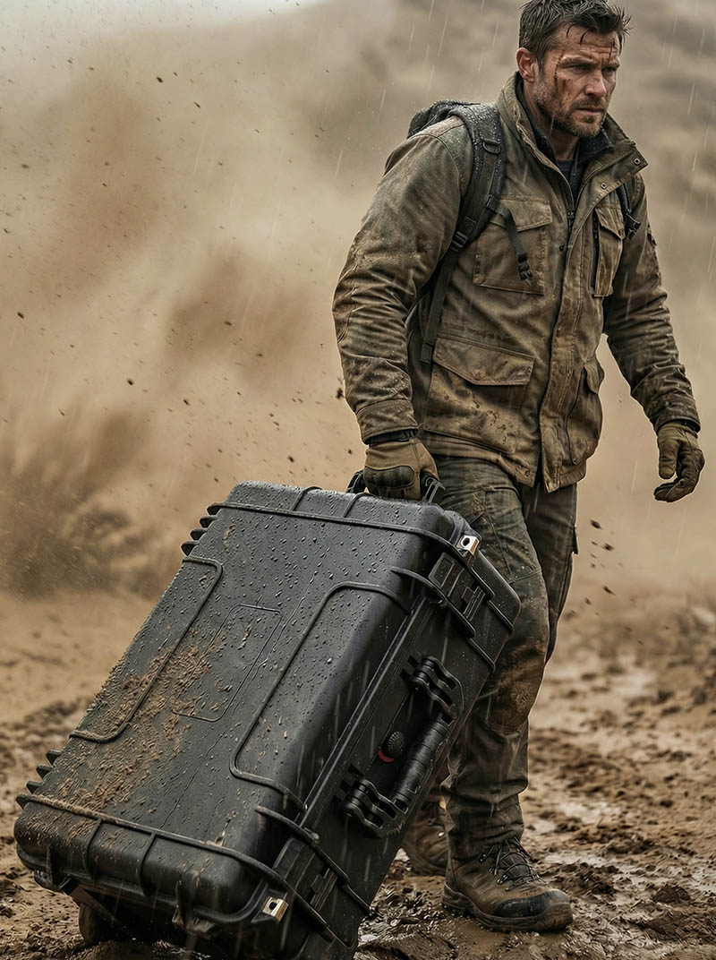 Sistema de movilidad y maniobras de grado industrial: Mover una funda protectora tan resistente requiere un verdadero diseño industrial. Lo hemos equipado con un sistema de barra de tracción retráctil para una tracción más estable; cuatro ruedas de gran diámetro equipadas con cojinetes, colocadas debajo de la barra de tracción, garantizan la seguridad en pendientes o cuando está parado dentro de un vehículo. Este sistema permite que una sola persona maniobre fácilmente una carga de casi 100 kg, moviéndola con tanta agilidad como una maleta normal en un terreno llano.