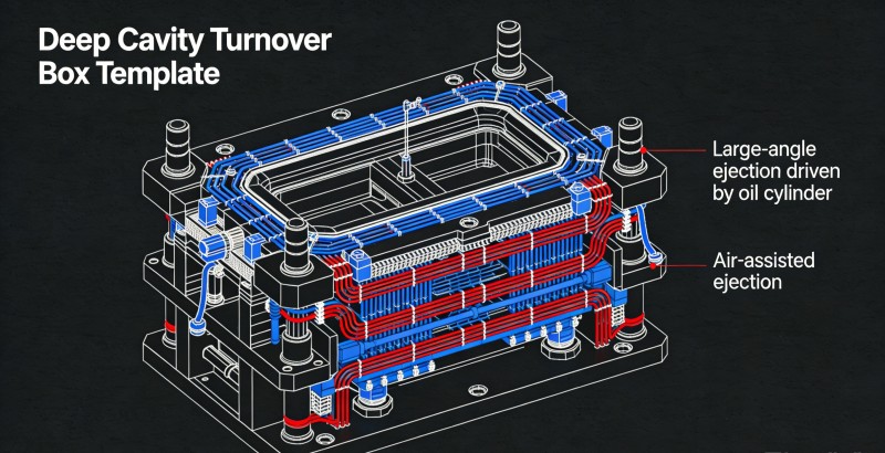 Desafío: El gran volumen y las paredes gruesas de los contenedores logísticos provocan tiempos de enfriamiento prolongados, lo que limita la capacidad de producción. Solución: Diseñe canales de enfriamiento de alta velocidad en serie de múltiples capas que cubran densamente todas las áreas de paredes gruesas. Para contenedores de cavidad profunda, combine “eyectores inclinados de gran ángulo accionados por cilindros hidráulicos” con “eyección asistida por gas” para garantizar un desmolde rápido y suave en un tiempo mínimo sin deformación ni adhesión al vacío, minimizando los ciclos de producción.
