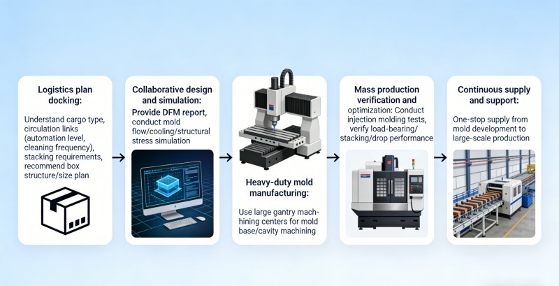 1. Alineación de soluciones logísticas: comprenda su tipo de carga, las etapas de manipulación (por ejemplo, nivel de automatización, frecuencia de limpieza) y requisitos de apilamiento para recomendar soluciones óptimas de estructura y tamaño de contenedores. 2. Diseño y simulación colaborativos: proporcione informes DFM completos y realice simulaciones de flujo de molde, enfriamiento y tensión estructural para garantizar soluciones de molde óptimas tanto en rendimiento como en costo. 3. Fabricación de moldes de servicio pesado: utilice grandes centros de mecanizado de pórtico para garantizar precisión y rigidez en el mecanizado de cavidades y bases de moldes de gran tamaño. 4. Validación y optimización de la producción en masa: realice pruebas de producción continua en máquinas de moldeo por inyección para validar métricas de rendimiento críticas (pruebas de carga, apilamiento, caída) y finalizar los procesos. 5. Suministro y soporte continuos: Ofrecemos suministro integral desde el desarrollo de moldes hasta la producción de moldeo por inyección a gran escala, garantizando una calidad constante del producto y una entrega oportuna.